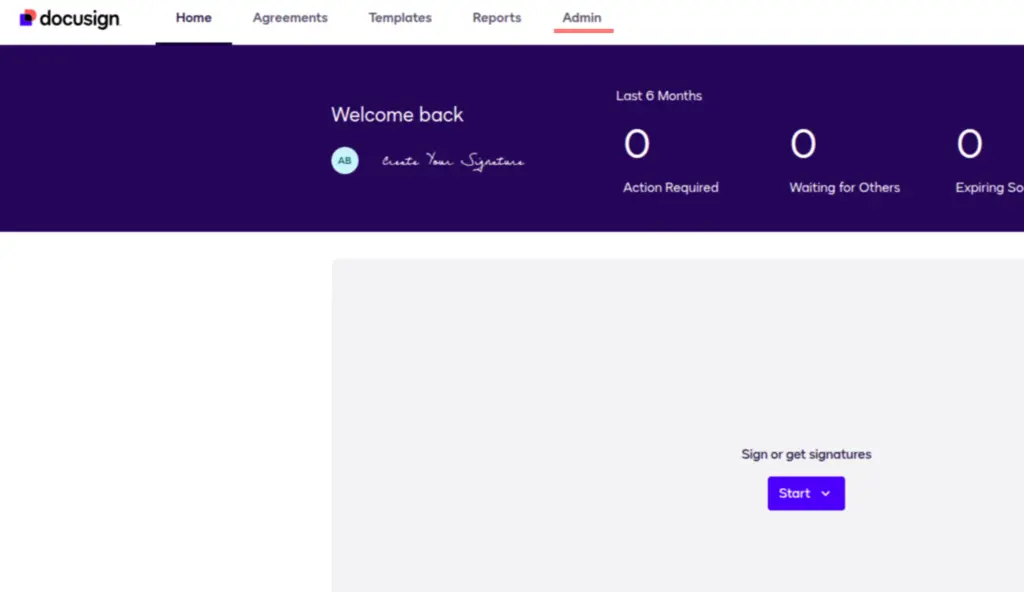 From here, you'll want to create a Connect Key in your DocuSign account. If you already have one, then you can skip these next steps. First, you'll want to head over to the 'Admin' page for your account.