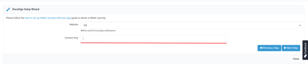 Now, that you have your connect key, return to the docusign set up wizard in Kademi. Select the website you want to use Docusign with and paste your Connect Key into the field pictured below.